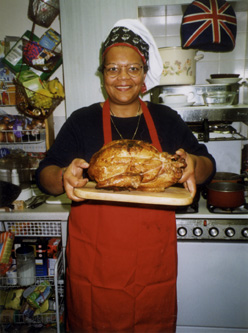 Lisa with our 1998 Thanksgiving turkey. Roasted in the "Big Webber" and served with all the trimmings to Steve's Mum & Dad.