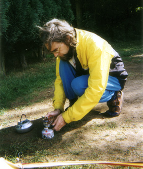 This is how our days under canvas invariably begin: with me firing up the Coleman stove to brew up some coffee.