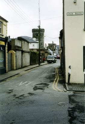 Street scene in Nenagh, Co. Tipperary, with a glimpse of some fascinating of old fortifications.