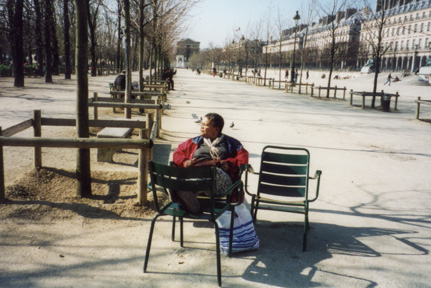 Lisa relaxing in the March sunshine, on the Rue de Rivoli side of the Tuileries, after another morning's hard shopping: this time for a new handbag!