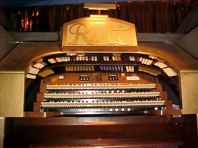The console of the Spurden Rutt theatre organ is surrounded by illuminated glass panels which change colour while playing.