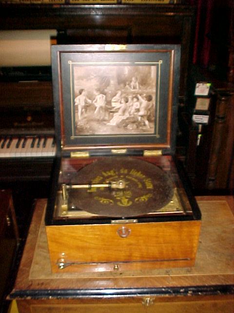 A beautiful Victorian-era musical box. The basic design centred around the disc is familiar to those of us of "a certain age"!