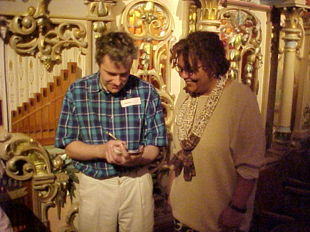 A besotted fan getting an autograph from Julian Dyer, pianolist on the recently released Shellwood CD of Jelly Roll Morton piano rolls.
